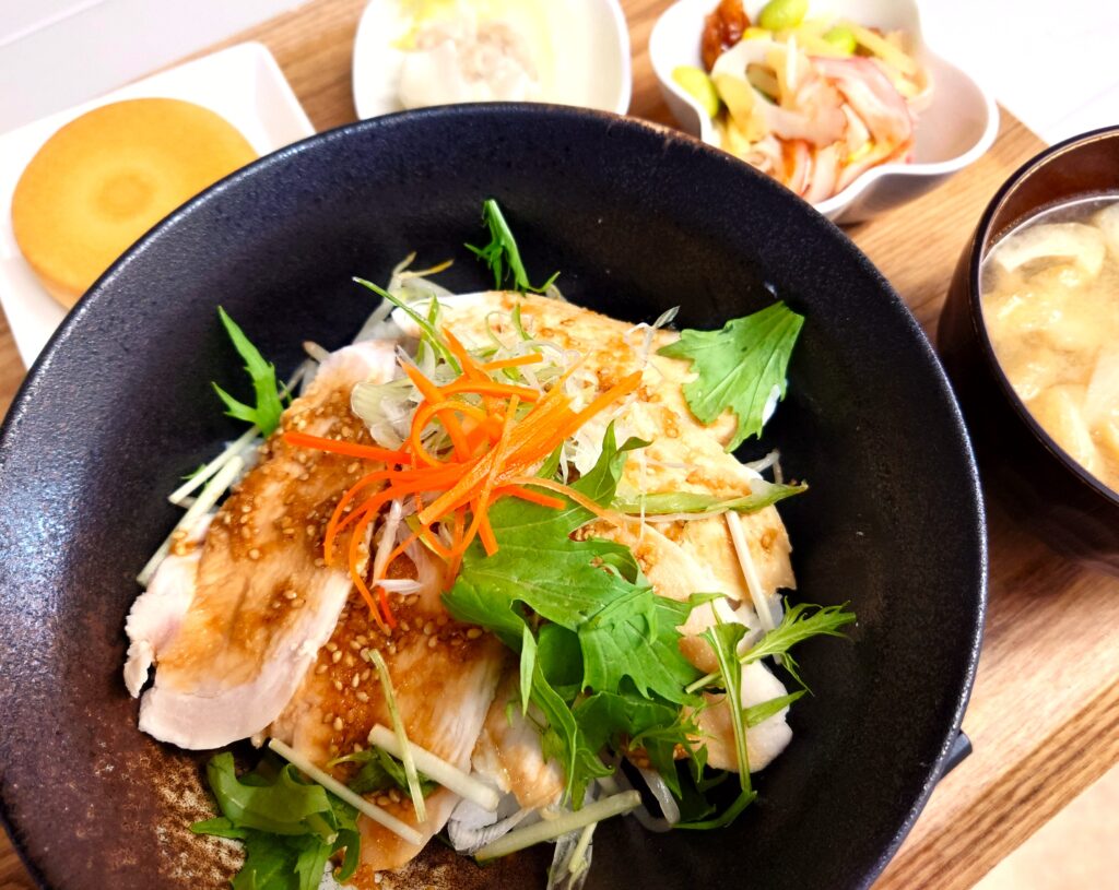 蒸し鶏のゴマダレ丼、五目焼売、中華風酢の物、みそ汁