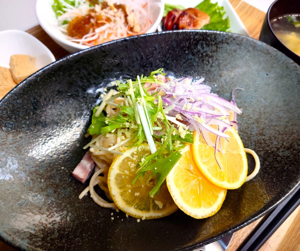 レモンクリームパスタ、照り焼きチキンステーキ、野菜サラダ、スープ