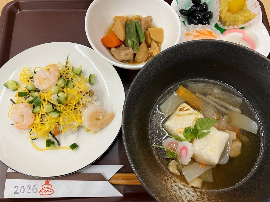 ちらし寿司やお雑煮など、お正月を感じられる食事で、